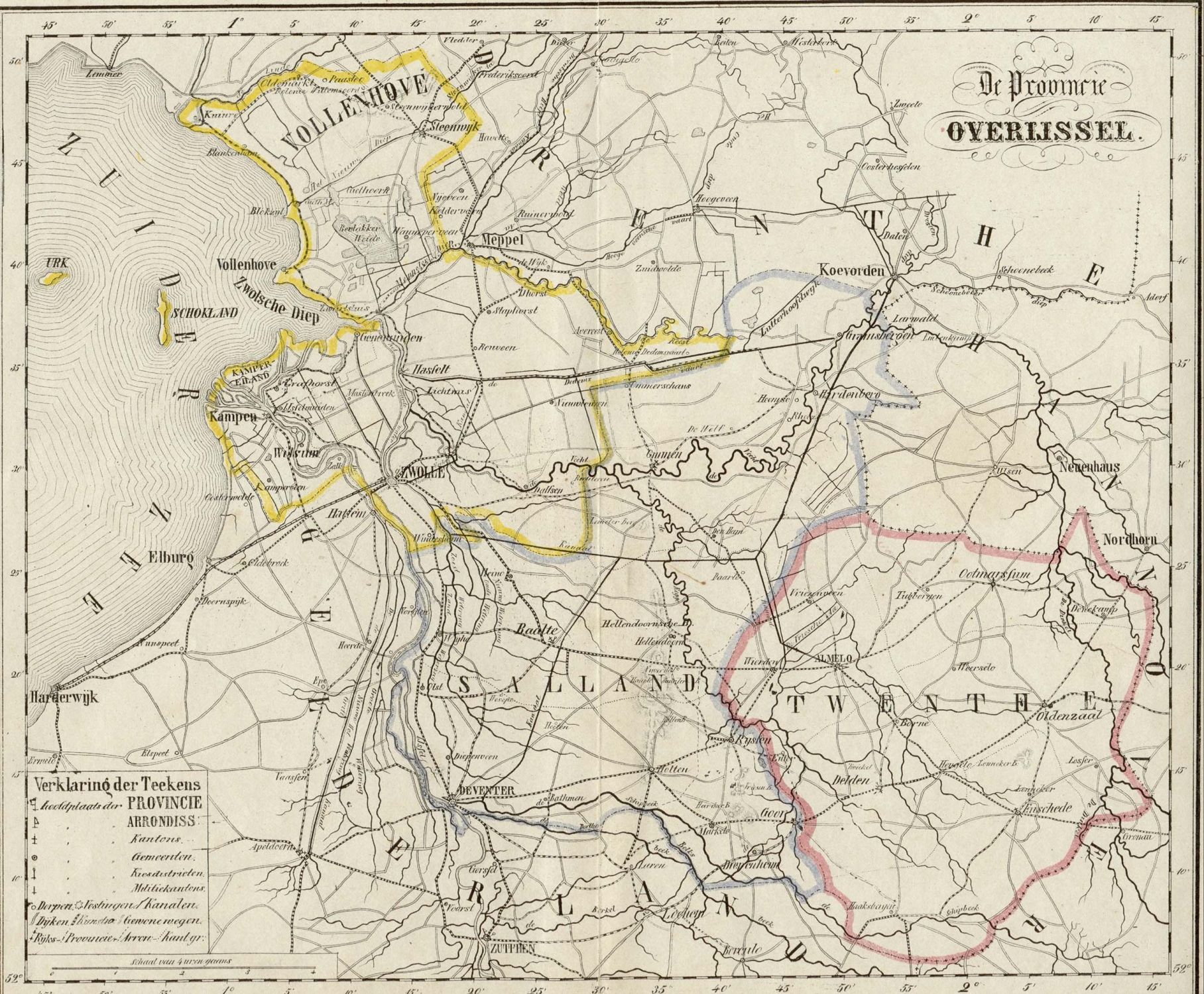 Tweede en verbeterde druk / uitgegeven door Dr. L. Ali Cohen - schaal [ca. 1: 450.000]. - Groningen: J.B. Wolters, 1864 (Groningen: J.H. v.d. Weijer). -1 kaart : gedrukt, gedeeltelijk handgekleurd; 20 x 24 cm, blad 24 x 30 cm. - F.E. Brugsma’s Atlas van het Koninkrijk de Nederlanden en zijne Overzeesche Bezittingen; Blad no IX Titel rechtsboven. Verantwoordelijkheidsvermelding van de atlas ontleend aan gegevens van Wolters-Noordhoff Atlasproducties verstrekt in september 1989. Nulmeridiaan van Amsterdam. Linksonder de schaalstok in uren gaans. Beslaat provincie Overijssel en aanliggende gebieden. Hoogtevoorstelling met schrapjes. De arondissementsgrenzen zijn met gekleurde biezen aangegeven. De legenda linksonder geeft o.m. de hoofdplaatsen van de arrondissementen, kantons, gemeenten en die van de kiesdistricten en militie-kantons.